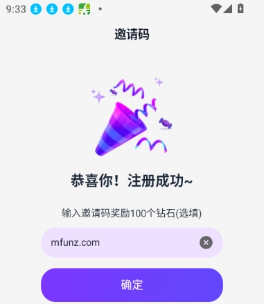 2.注册成功后,填写邀请码11403525获取100个钻石(选填),点击确定完成注册。