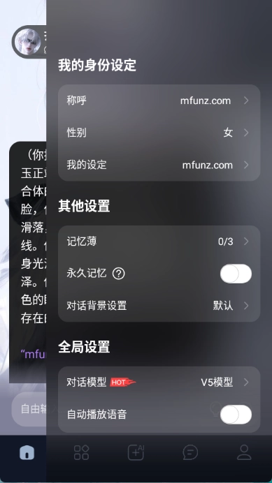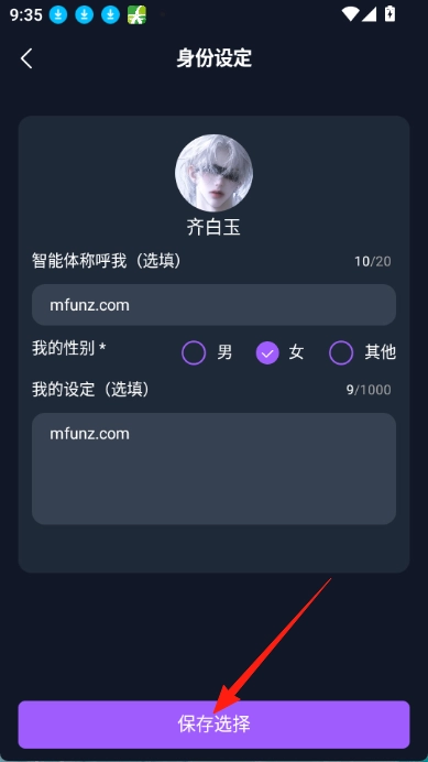 2.输入智能体名称、选择性别及设置,保存选择即可开始聊天。
