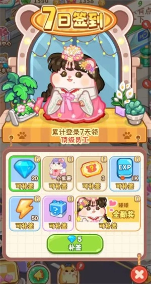 开服首日参与签到活动,累计可得钻石20、精英员工小紫薯*1、豪华招募券*3、经验书*1000、体力*50、神奇道具盲盒*1及顶级员工臻臻*1。若遗漏签到可用钻石补签。