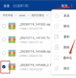 2. 点击右上角菜单图标选择"重命名"功能。