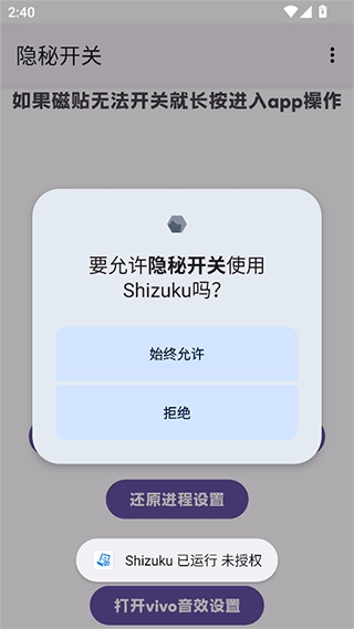 首先,该功能需要配合Shizuku软件完成授权激活才能使用,因此你的手机里得先安装好这个软件,并且确保它处于开启运行的状态。