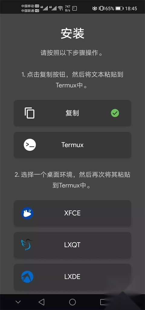 一键安装脚本:复制命令到Termux自动完成系统部署,卸载时彻底清理空间。