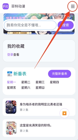 1、进入到菲特动漫软件之后直接点击右上角这个三个杠图标。