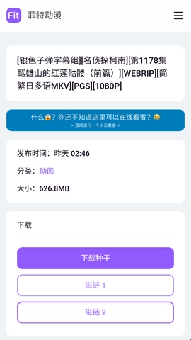 不收费、不办会员、不看广告解锁,所有番剧直接观看,更新速度及时,连载新番每日同步更新,追番不滞后,热门内容快速上线,高清流畅播放,画质清晰、加载快速,翻页切换不卡顿,低网速也能稳定看,轻量易用不占地,安装包小、运行流畅,操作逻辑简单,新手也能快速上手,离线 + 追番一体,支持离线与追番提醒,兼顾无网观看与实时追更需求。