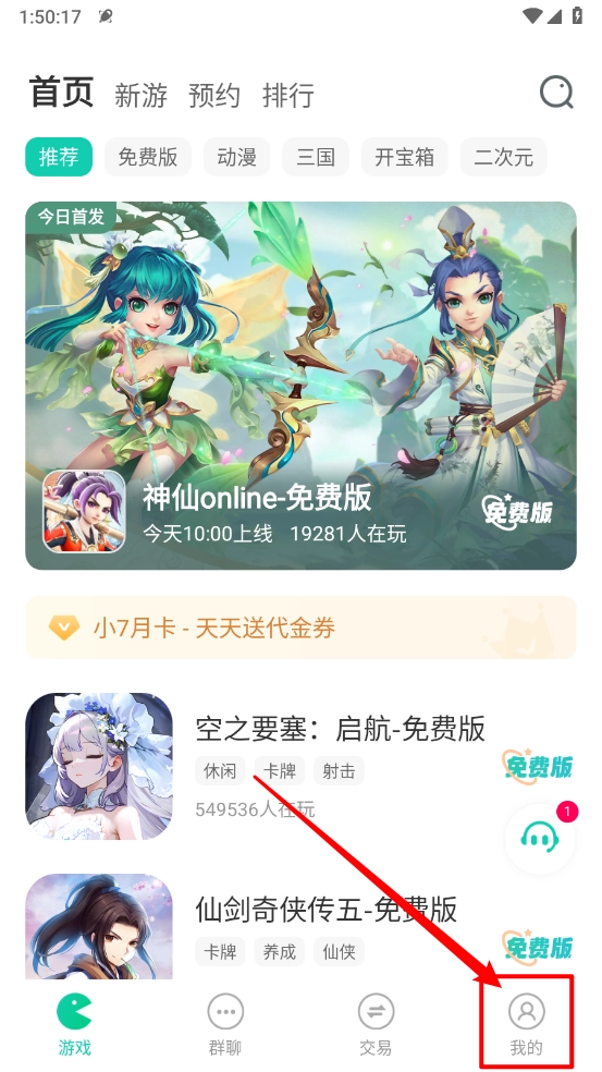 1、启动小7手游应用,进入主界面后选择底部"我的"入口。