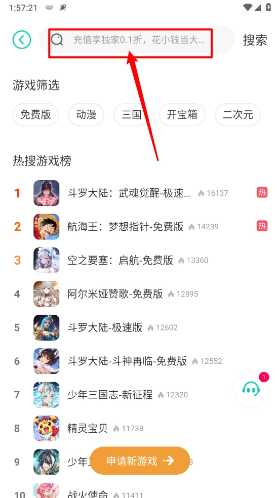 2、切换至"排行"页签,查看实时热度榜单选择游戏。