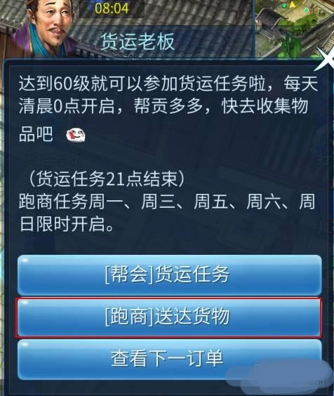 任务等级69级,单人模式限周一、三、五、六、日19:10-22:10开放。帮会频道提示刷新后,前往帮会城市货商老板处领取任务。货车跟随玩家移动,超出距离自动停滞。任务需通过特定传送点前往杭州-镇郊荒野-杨家镇或杭州-镇郊荒野-兰若寺线路。野外区域随机触发飞贼事件,未及时击杀导致货车受损将影响银票收益。查看货物需靠近货车交互,超时操作同样造成损失。到达目的地与NPC对话完成交付。