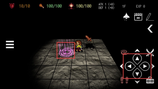 按想要去的方向的按钮移动英雄,面对附近敌人时,按剑上的攻击按钮造成伤害,通过移动和攻击的配合击败地牢中的敌人。