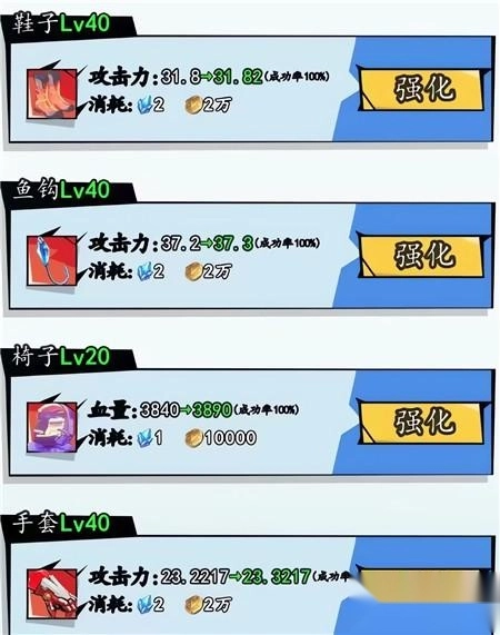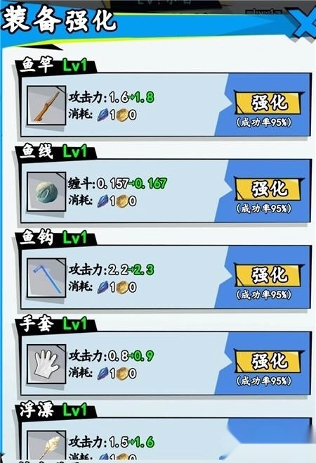 攻击力:【装备】鱼竿,鞋子,鱼钩,手套,浮子升级