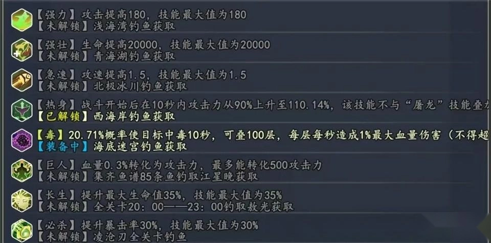 鱼线:缠斗时间。字面意思,提高战斗时长,时间越长能攻击的次数越多,很好理解吧