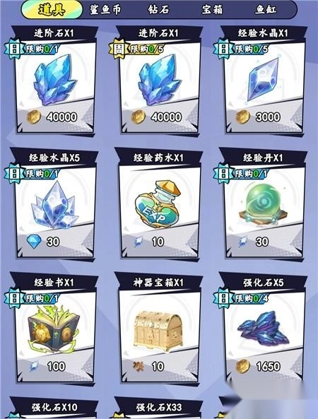 重点抢购里,前期优先级 金币>幸运丹>高级鱼饵>催化剂>神器碎片。