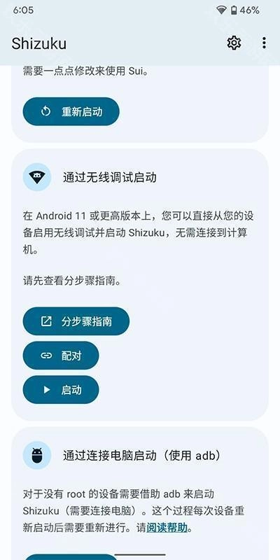 软件中没有root的设备需要使用adb启动,App和Shizuku均有详细的文档指南,只需让用户分别安装软件和Shizuku。