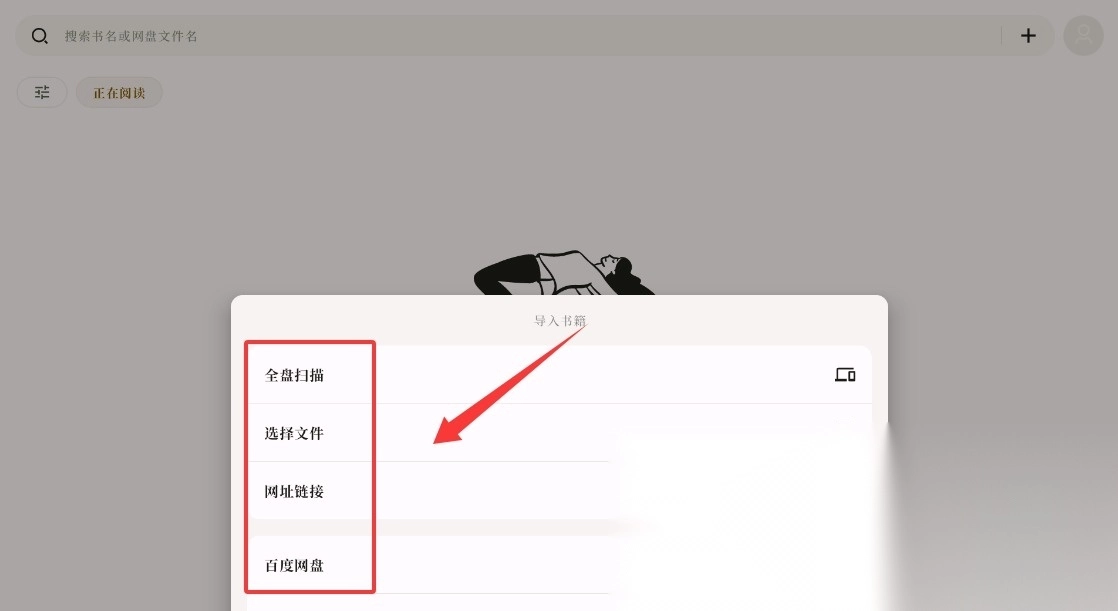 进入书架界面后,点击右上角的加号按钮,就能选择本地导入、网络添加等多种书源导入方式。