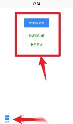 在“店铺”栏目里,你可以进行批发店的登录或注册操作,还能联系获取店铺管理方面的支持。