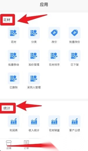 点击“应用”栏目可使用花材管理、分类、改价、批量操作等功能,并在统计板块查看利润、收入及客户业绩数据。