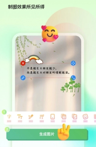 当然,你也可以在编辑页面添加贴纸,调整图片的位置、缩放比例,还能修改文字的颜色、字体、大小,切换横排或竖排样式,拖动文字位置,或者自由发挥创意,制作出自己喜欢的图片!