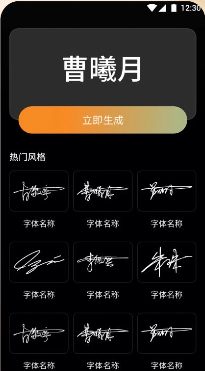 提供楷书、行书、草书、隶书等传统字体,还有创意连笔体、防伪镜像体这类现代风格字体。