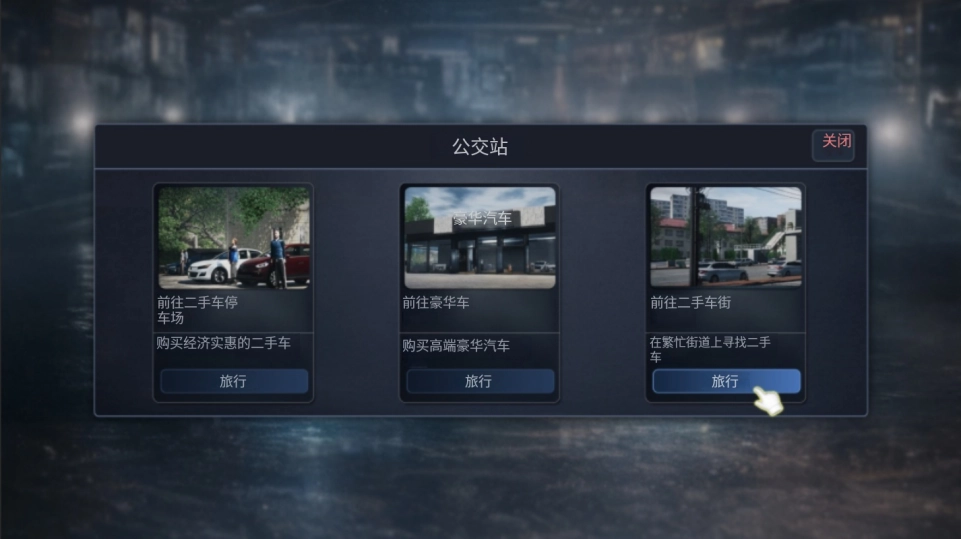 2、首任务目标是“与车主谈并协商一个比原价低10K的价格”,建议先前往“公交站”选择“前往二手车街”(经济实惠路线),寻找待售车辆进行议价。