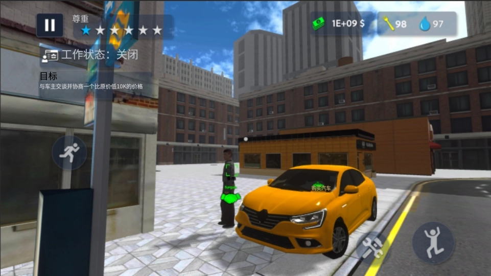 3、途中绿色箭头为导航路径,按指引走到目标地点(如车行、维修区、售票处等)可触发任务交互;注意屏幕左上角“工作状态:关闭”需手动接取任务才能激活。
