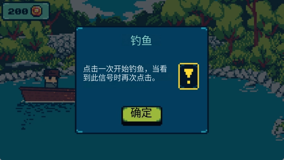 2、首次钓鱼操作教学:点击一次启动钓鱼,当浮标出现黄色感叹号信号时,立即再次点击屏幕,触发咬钩判定,进入拉鱼环节。
