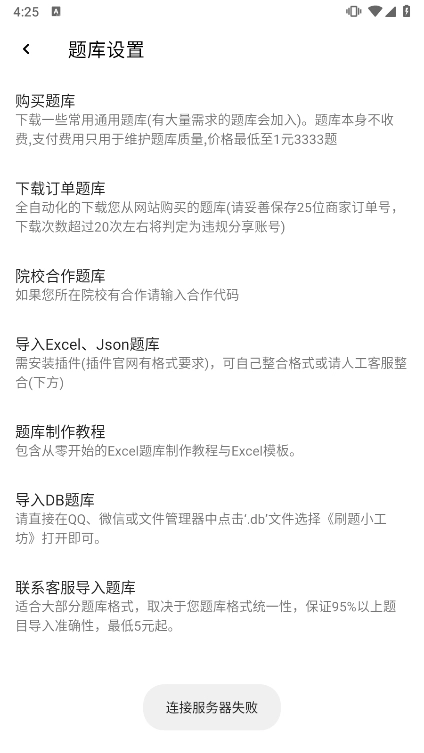 刷题小工坊提供三种题库使用方式:学校登录(企业或元宵提供专有题库)、互联网专有题库、自行导入题库,操作简单易设置,有需求的用户可以前来使用。