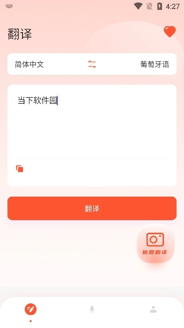 点击打开软件后,无需繁琐的登录步骤,就能直接进入翻译首页,首页上清晰呈现着翻译输入框和各类功能按钮。