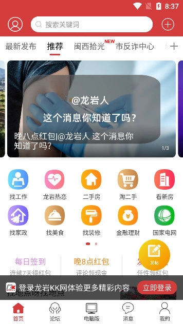 龙岩KK网既满足了用户获取本地资讯的需求,又整合了求职、租房、缴费等生活场景,真正实现了一站式便捷服务。软件互动功能丰富,语音发帖、周边动态等设计,让用户既能获取信息,也能参与社区交流。同步权威媒体报道与大咖入驻解答,确保了内容的真实性与专业性。就像淮安二院互联网医院专注提升本地医疗服务体验一样,它也始终聚焦龙岩用户的生活需求,从界面操作到实用福利,每一处细节都体现着对本地用户的关怀,切实为龙岩居民的日常生活增添了便捷与色彩。