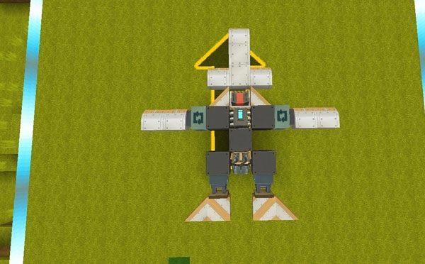 最后的安装步骤来啦,接下来我们要安装四个尾翼方块,把它们放在铰链方块的旋转面上,每侧各放两个,要注意摆放的朝向哦: