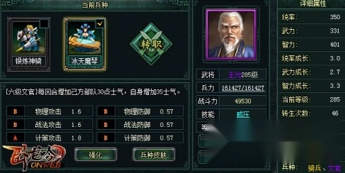 每个武将都拥有相应的成长值,武将完成转生后,会根据成长值获得对应的属性成长,首次转生要求武将等级达到60级。