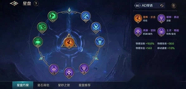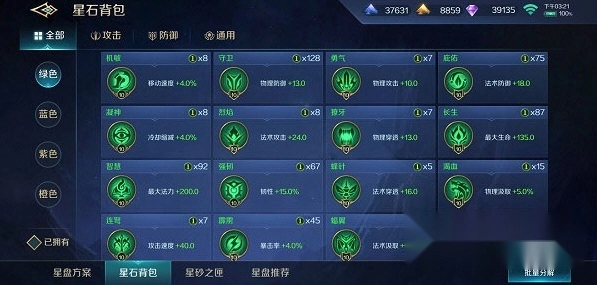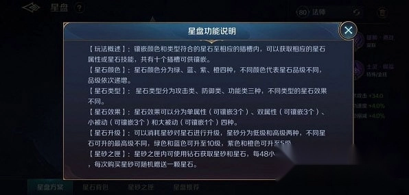 星盘作为星石的承载器具,设有10个凹槽用于镶嵌各类星石,具体包含三个绿色凹槽、三个蓝色凹槽、三个紫色凹槽与一个橙色凹槽。绿、蓝、紫、橙这几种颜色的星石均划分为攻击、防御、功能三类,并且每种颜色的星石在每一类中仅能装配一颗。