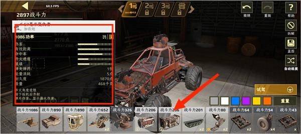 玩家在改装界面对自己的战车进行改装时,左上角会显示所选配件的相关数值,下方则罗列着可用的配件及其对应的战斗力。玩家可以通过对这些配件进行合理搭配,打造出专属于自己的最强战车。
