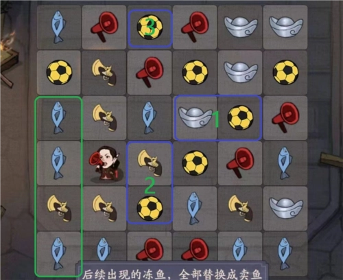 在还没获得3只鱼的技能之前,每一列都得留1个冻鱼仔,要是能再多1个足球就更理想了。