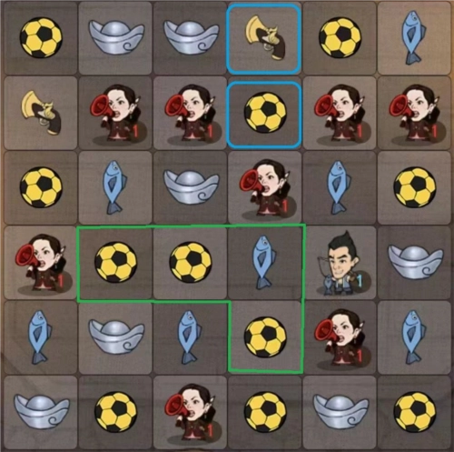 如果把蓝框里的火铳或足球销毁掉,就能消除5个格子,并且还会触发下方绿框的合成,再消除2格,总共能消除7格。