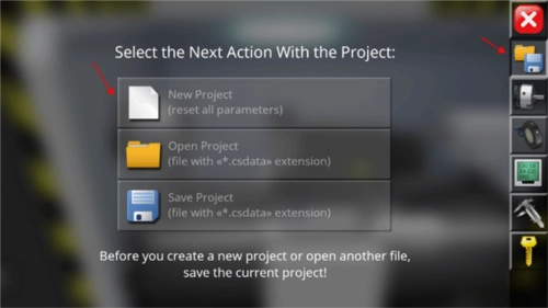 右上方的文件图标代表项目,你能对项目执行三种操作:新建、打开和保存,玩家只需点击新建项目,就能开始玩游戏了。