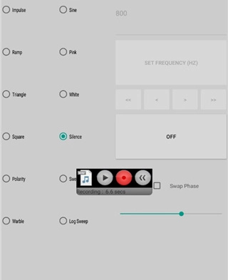 信号源具备白噪声(White)、粉红噪声(pink)、正弦波(Sine)、斜坡(Ramp)、三角波(Triangle)、方波(Square)、扫频(Sweep)等多种功能。在设定好频率后,可通过点击OFF、ON按钮以及调节音量来实现控制。