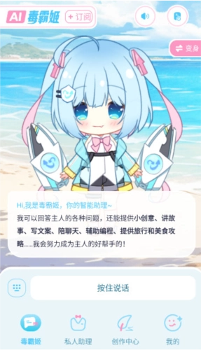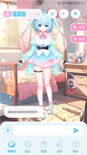 打开毒霸姬免费版,进入应用主界面后,能看到【毒霸姬】【遇见】【助理】【创作】【我的】这几个频道。在当前所处的频道里,我们可以通过语音或打字的方式与毒霸姬进行对话。