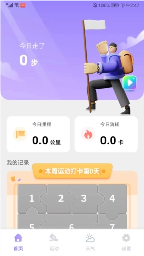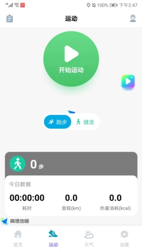 进入应用界面后,会看到包含【首页】、【运动】、【天气】与【设置】的栏目;在首页界面中,能查看今日的运动里程和消耗情况。