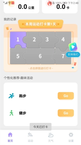 往下滑动页面,点击拼图就能完成运动打卡,同时还能参与平台推荐的跑步和健步活动。