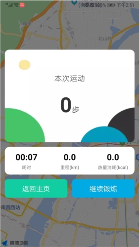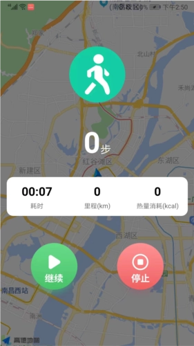 可以看到当前运动的耗时、里程和热量消耗情况,还能根据自身需求选择继续运动或者停止运动。
