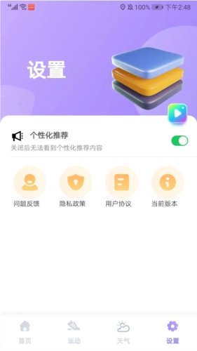 进入设置界面后,你可以找到个性化推荐、问题反馈以及查看当前版本等功能选项。以上内容便是云彩计步的使用方法。
