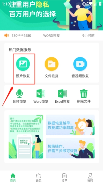 在手机上打开超级兔子数据恢复手机版,进入应用后选择你需要使用的服务,比如【照片恢复】。