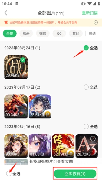 进入软件后,系统会自动开始扫描照片;扫描完成后,你可以选择想要恢复的照片,接着点击右下角的【立即恢复】按钮即可。