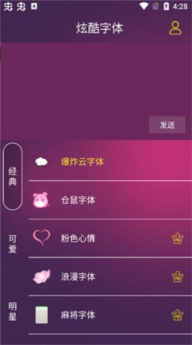 炫酷字体安卓版是长沙沙师弟网络科技有限公司推出的免费手机字体应用,为用户提供丰富多样的字体选择,助力打造个性十足的手机界面!软件内不仅收录了宋体、楷体、狂草等经典字体,还新增了易烊千玺、鹿晗、张艺兴、王一博、肖战、迪丽热巴等明星字体,每款字体都独具特色,且每日持续更新。感兴趣的用户不妨前来体验!