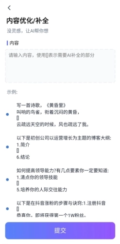 打开功能页面后,你会发现这里还包含了更多实用功能,像写作助理、风格润色、口播稿创作、内容总结、奥数解答、AI绘画、法律问题咨询等。直接打开对应功能,参照示例输入自己的问题就能使用了。