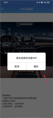 在绑定行车记录仪前,需先连接设备WiFi,然后点击确定。