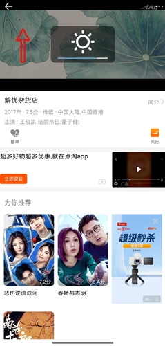 用户打开视频后,可通过上下滑动手指调节亮度,向上滑动亮度增加,向下滑动亮度降低。