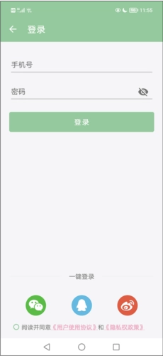 接下来,在登录页面勾选“阅读并同意用户使用协议与隐私权政策”,之后找到并点击“微信、QQ、微博”的选项。