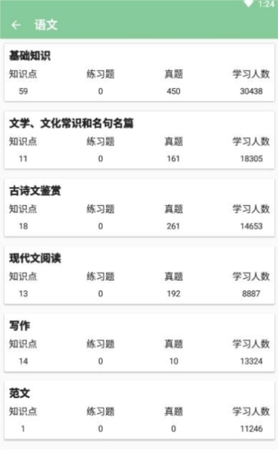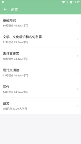 具体科目内部还细分为不同的知识板块,像语文科目就划分了基础知识、古诗文鉴赏、文学与文化常识及名句名篇、现代文阅读、写作以及范文等板块。